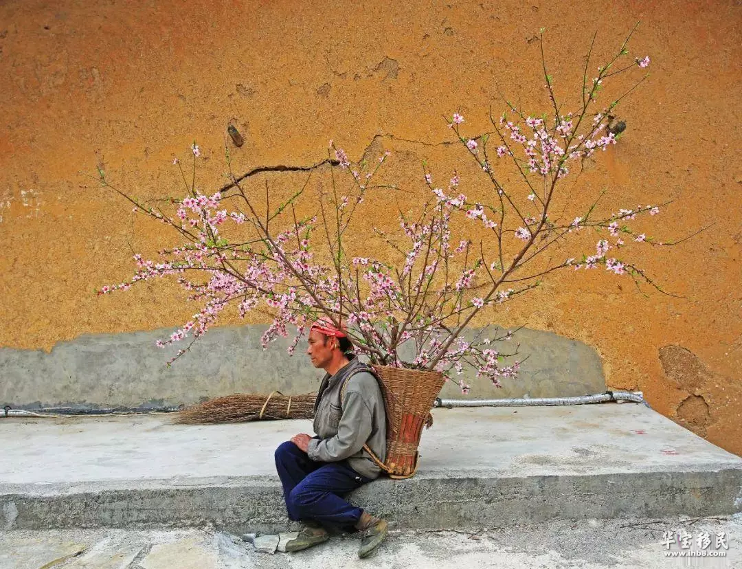 照片中的中年男子背着竹篼,里面装着一树桃花,淡粉的花儿与土黄色的村屋相互映衬,画面诗意盎然,却又透出几分寥落。