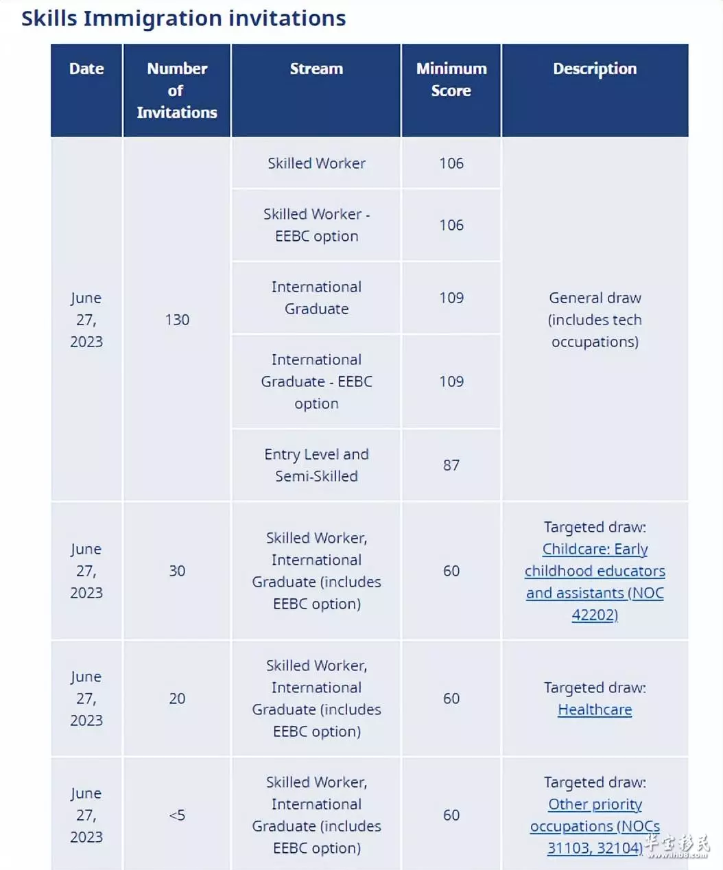 加拿大时间2023年6月27日,bc省本周抽选了130人,技术工人类别(含ee及非ee)抽分为106分。留学生类别(含ee及非ee)抽分为106分,低技术类别87分;幼教类别抽选30人,分数60;医护类别抽选20人,分数60。
