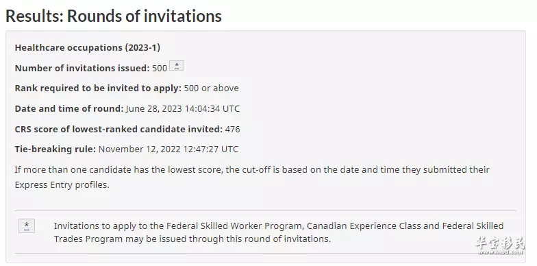 加拿大时间2023年6月28日,加拿大移民局针对ee医护类别进行了抽分!本次共计抽取500人,邀请分数为476分!