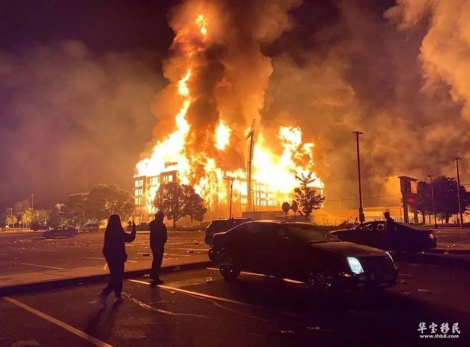 “东哥故居”,美国明尼苏达州明尼阿波利斯市第三辖区警察局大楼在29日被该市的抗议人群焚毁。
