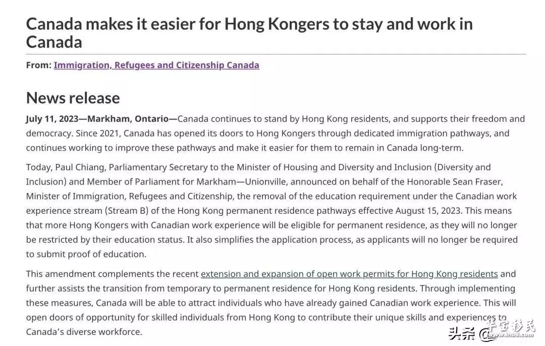 7月11日,加拿大移民部公布了香港人救生艇计划修订细节,取消了stream b(工作移民)的学历限制,将于8月15日生效。