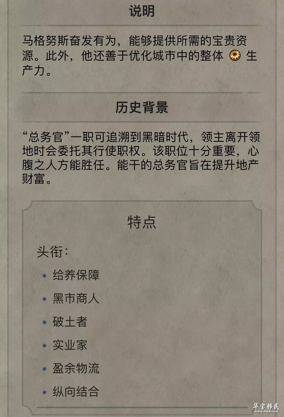 从文明百科的说明可以看到,总务官马格努斯是一个奋发有为的人,可以提供所需的宝贵资源,此外,他还可以优化城市中的整体生产力。