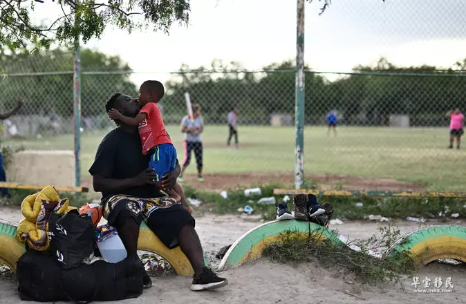 当地时间2023年5月16日,移民在美墨边境城市墨西哥雷诺萨的一处收容所外亲吻自己的孩子。新华社 图