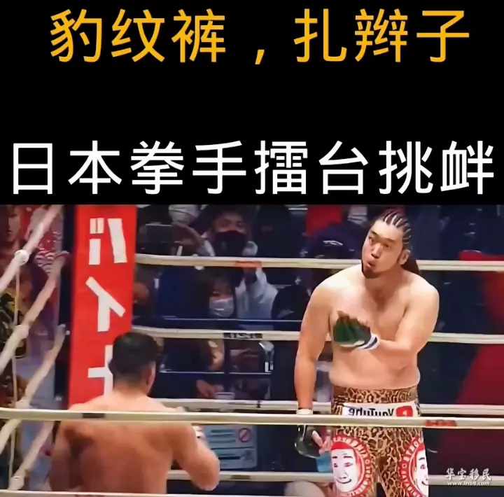 豹纹裤,扎辫子。日本拳手擂台挑衅。